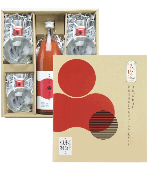 酒楽。 のお酒と東白川村のトマトジュースの夏ギフト<レッドサン> トマトジュース+大吟醸+特別純米酒セット 東白川村:トマトジュース900ml_1本 酒楽。:大吟醸<金銀花酒造_愛知一宮>300ml_1本 特別純米酒<澤田酒造_愛知常滑>300ml_1本 ギフトBOX付き |